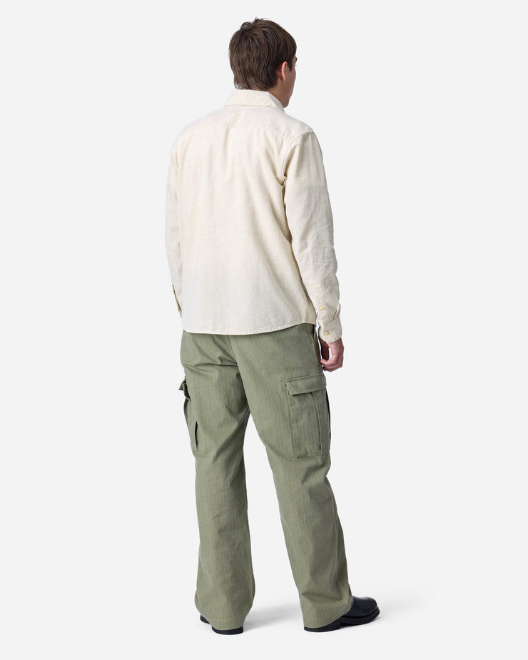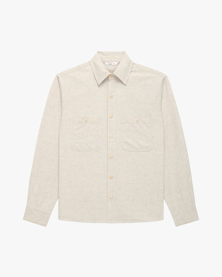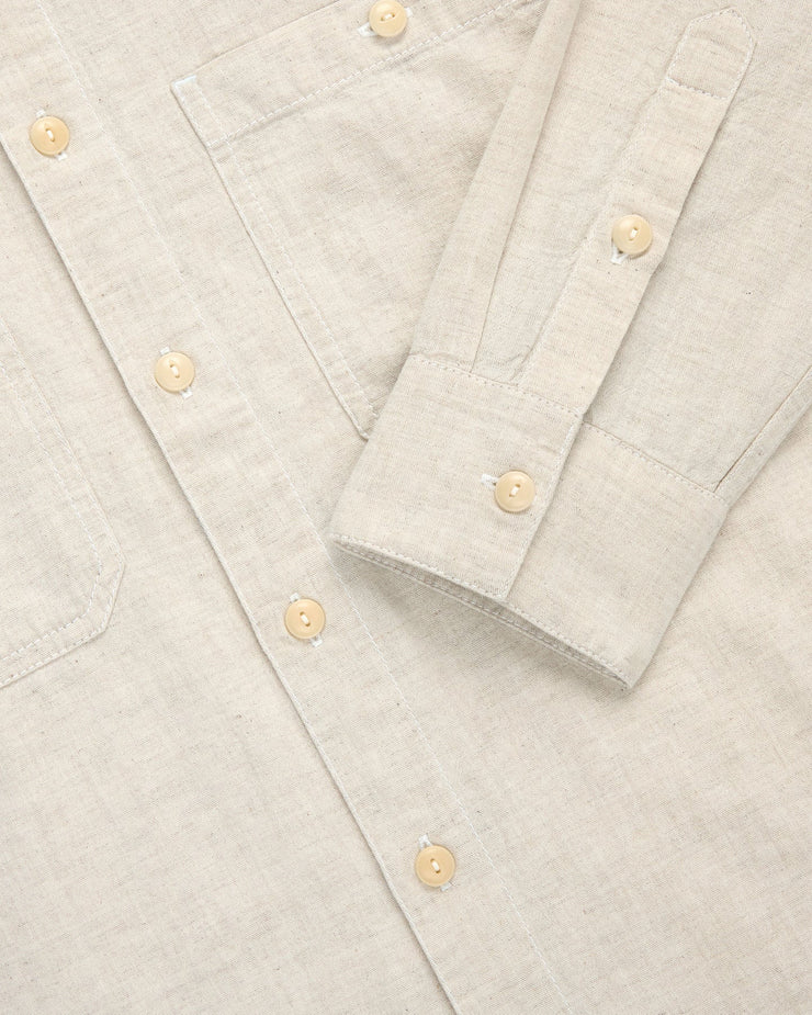 Garment rinsed for comfort and finished with natural corozo fisheye buttons, this piece offers durability and an easy hand feel, making it a versatile year-round shirt.
