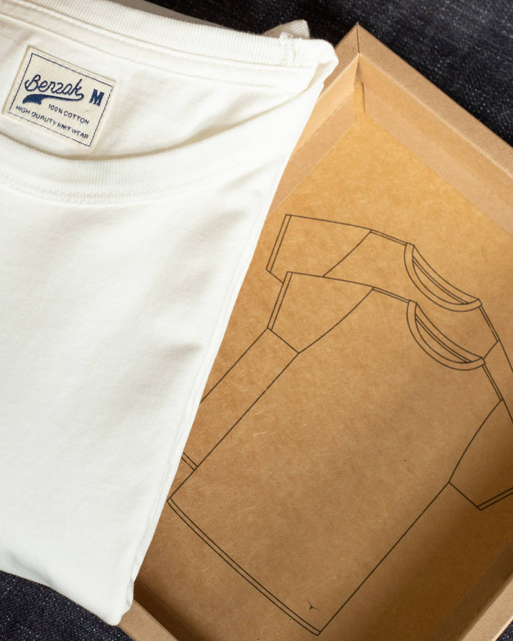 The BT-2P delivers two refined essentials in one considered package. Built from a 220gsm compact jersey knitted exclusively for BENZAK, these tees are designed to hold their shape and structure over time. The compact knit gives the fabric a clean, dense hand feel that resists distortion, maintaining a consistent fit wash after wash.