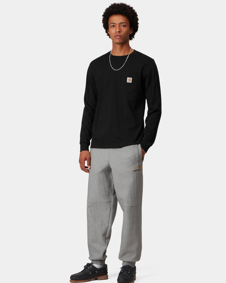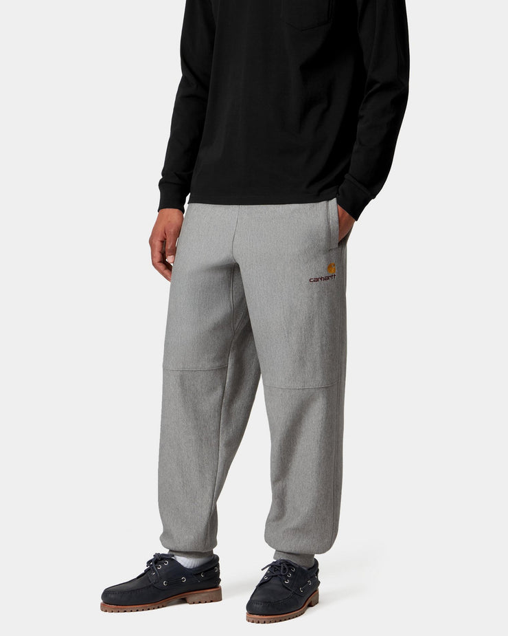 The American Script Jogging Pant is crafted from heavyweight 12.4 oz cotton-poly jersey, brushed to create a soft fleece-like backing for warmth and comfort. Designed in a loose fit, it offers ease of movement and a laid-back silhouette, reinforced with a crotch insert for durability.