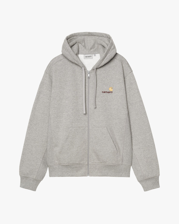 The jacket features an adjustable hood, a full zip closure, and a split kangaroo pocket for practicality. Two-tone American Script embroidery at the chest provides a distinctive finishing touch.