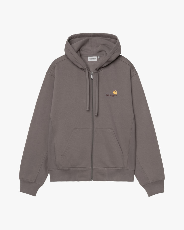 The jacket features an adjustable hood, a full zip closure, and a split kangaroo pocket for practicality. Two-tone American Script embroidery at the chest provides a distinctive finishing touch.