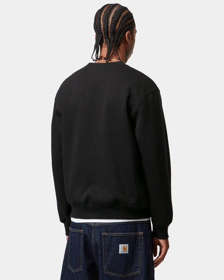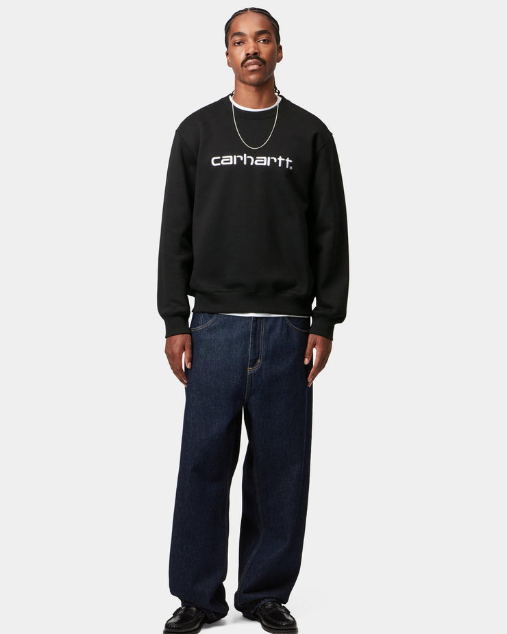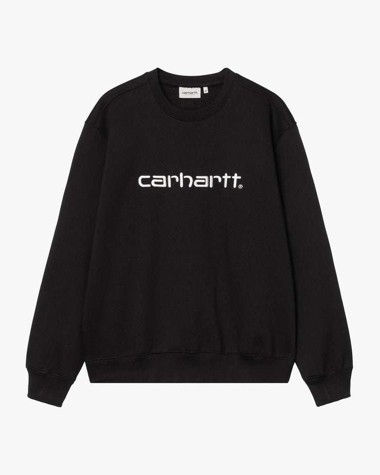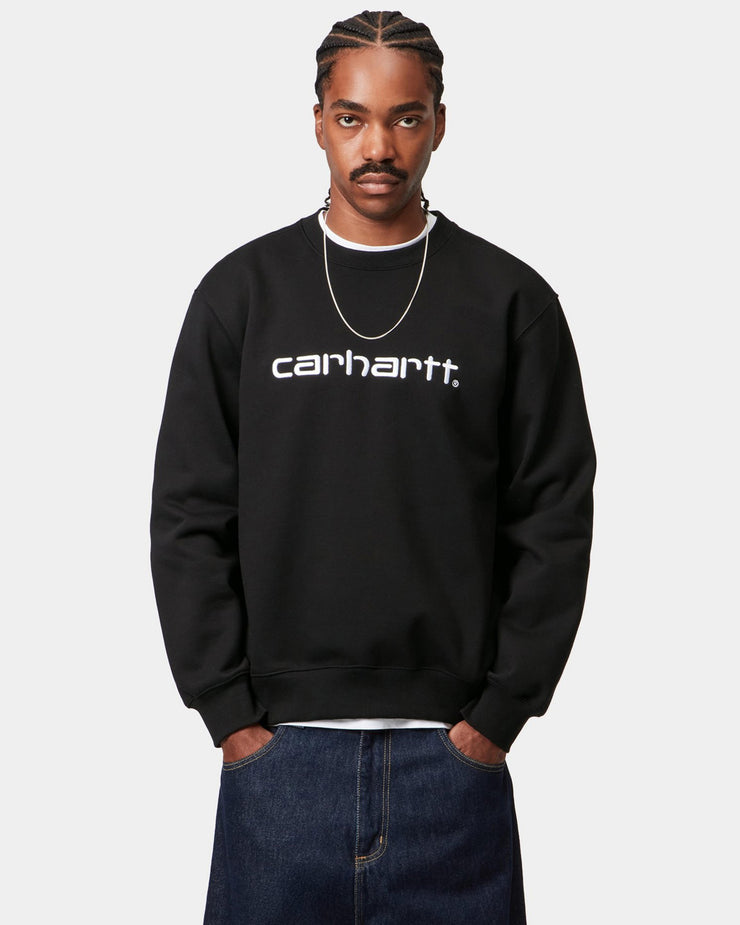 The Carhartt Sweatshirt offers a clean, classic look with a relaxed silhouette and comfortable feel. Made from a heavyweight cotton-polyester jersey, it features a brushed interior for a soft, fleece-like backing that provides warmth and comfort throughout the day. Its loose fit makes it ideal for layering, while the ribbed collar, hem, and cuffs ensure a secure, structured finish. The look is completed with an embroidered script logo across the chest for subtle branding.