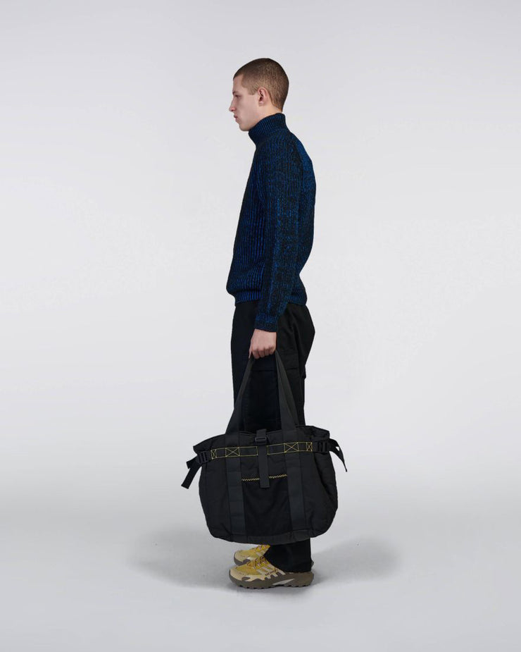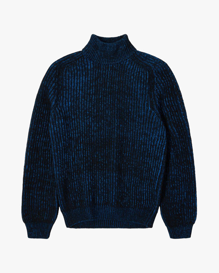 The EDWIN Roni High Collar Sweater is a heavyweight knit designed to deliver warmth, structure, and a refined winter silhouette. Made from a premium blend of 50% Merino wool and 50% acrylic, it offers both softness and durability. The oversized fit provides a relaxed, contemporary shape, while the high collar and fully fashioned armholes add a considered touch of design. Finished in a Black / Blue colourway, this dense knit is the ideal piece for the colder months.