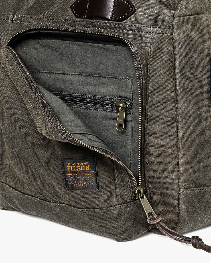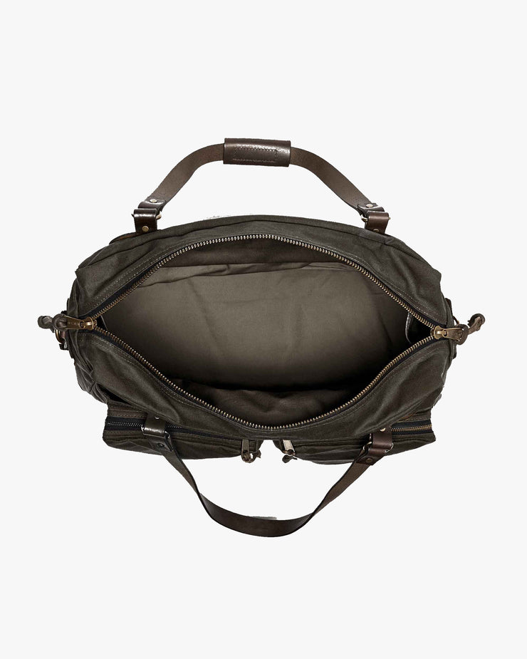 The 48-Hour Tin Cloth Duffle Bag is designed for overnight and weekend trips, built from durable oil finish Tin Cloth that sheds rain and snow to keep your gear dry. It features a reinforced base for added structure, exterior pockets for convenience, and a dry finish Cover Cloth lining. The bag includes an adjustable, removable cotton webbing shoulder strap for shoulder or cross-body carry, along with vegetable-tanned Bridle Leather handles and a trolley strap for use with rolling luggage.