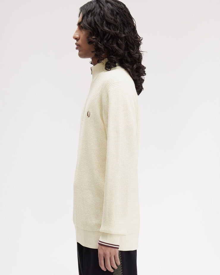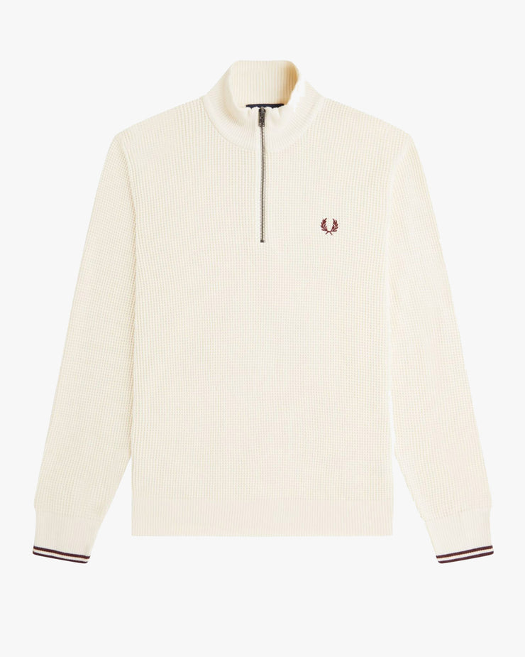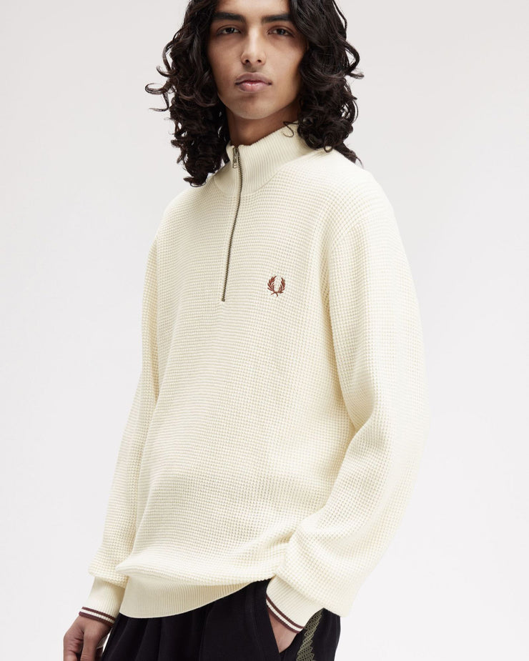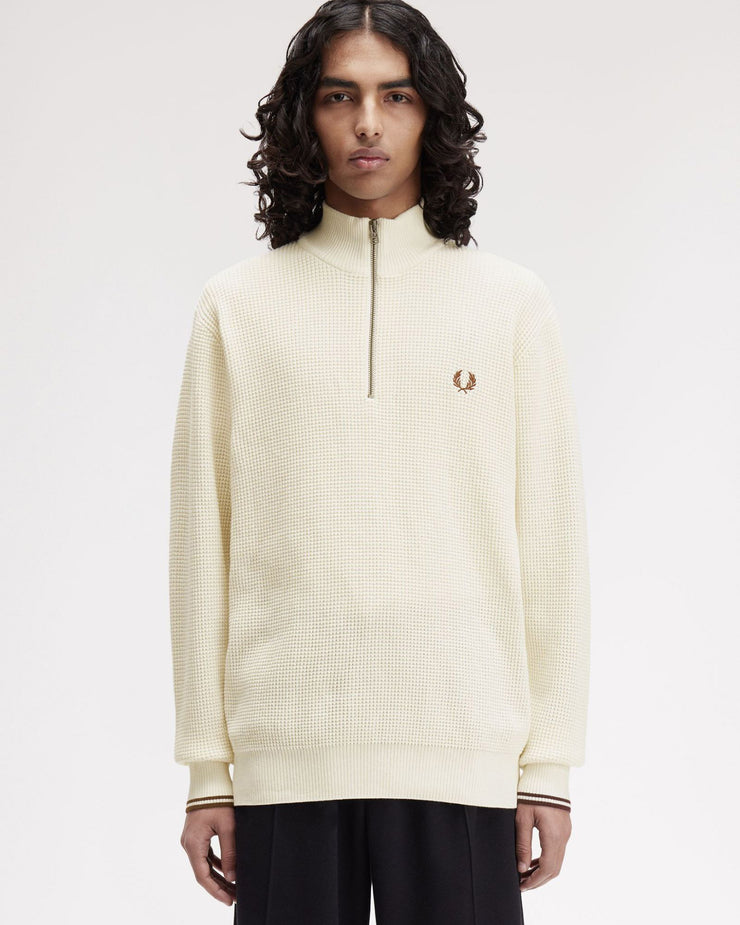 Cut in a regular fit, it features a half-zip fastening for adjustable styling, chunky ribbed trims for shape, and Fred Perry’s signature tipping at the cuffs for a subtle nod to brand heritage. Finished with the embroidered Laurel Wreath at the chest, it’s a pullover that blends practicality with understated style.
