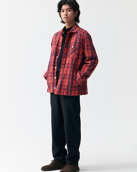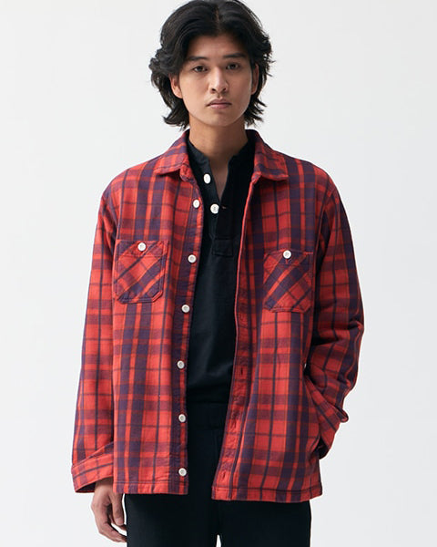 The Good On Flannel Check Sweat Shirt Jacket in scarlet blends the comfort of sweatshirt fleece with the depth and character of vintage flannel. Rather than using a woven check, the pattern is created through an advanced inkjet process printed directly onto the brand’s classic 9oz nap-back fleece — a cosy, tightly knit cotton fabric made in the USA. After the garment is sewn, it undergoes an additional overdye using reactive dye, muting the colours and giving the surface a soft, worn-in look that echoes the feel of heavyweight vintage flannel.