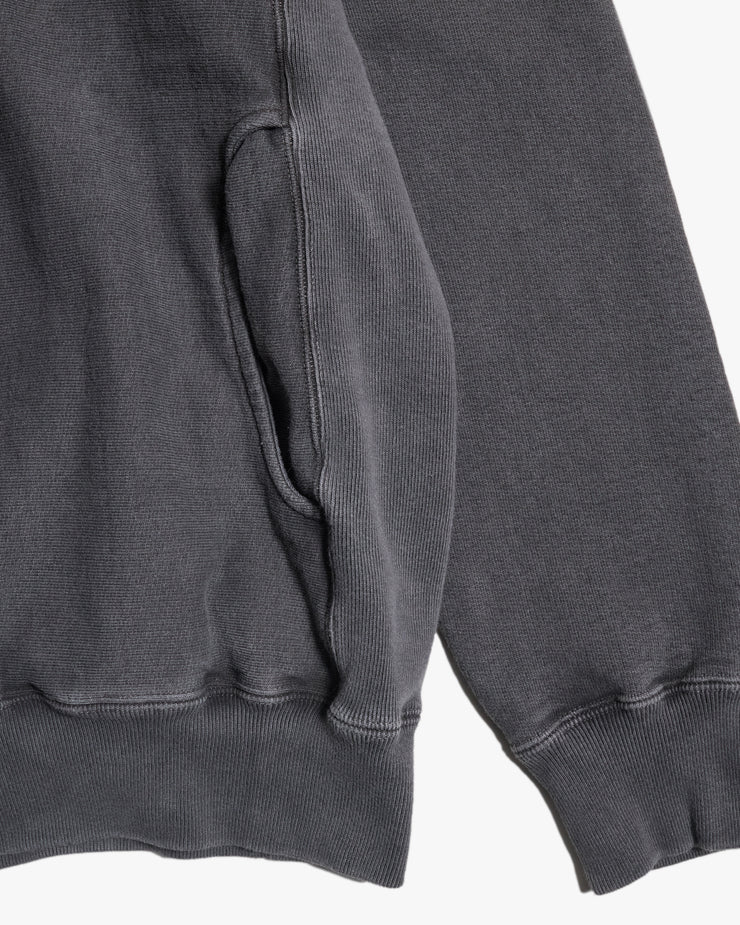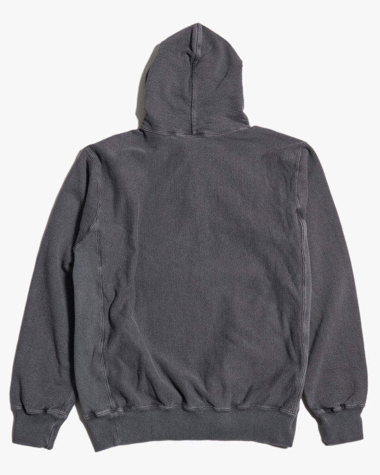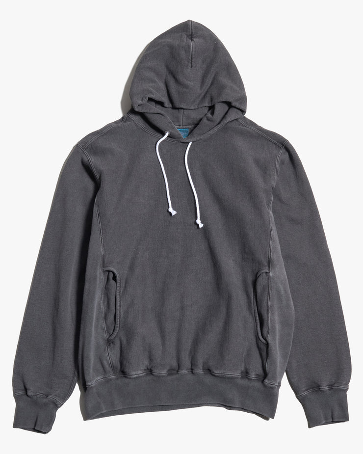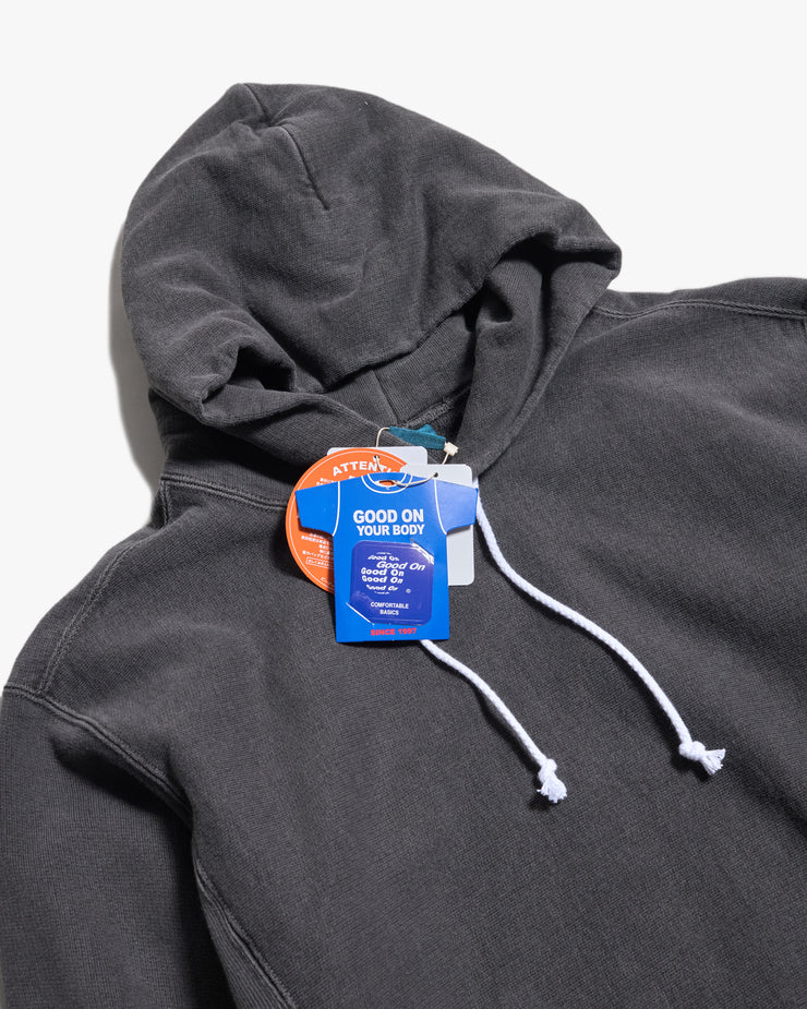 The Good On Heavy Pullover Hood Sweat in pigment-dyed black takes the familiar comfort of a classic hoodie and builds it out with serious structure. Made from a dense 13oz French terry milled in the USA, it has a firm hand and substantial weight, but the 3D-patterned construction is what gives it its distinctive comfort. The shoulders are wrapped with extra room at the back, meeting a forward transition stitch on the front, while ribbed side gussets run from the underarm to the hem to create natural movement and a relaxed silhouette.
