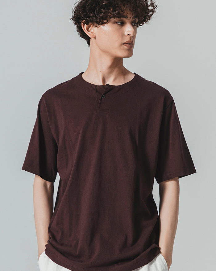 The neckline takes cues from vintage baseball uniforms, reinterpreted with a single-button Henley closure that avoids the underwear-like look of traditional multi-button plackets. This small detail creates a refined yet distinctly sporty design, staying true to baseball’s DNA while ensuring modern wearability. Finished with a spare button for practicality, it’s a versatile everyday essential with a nod to athletic tradition.