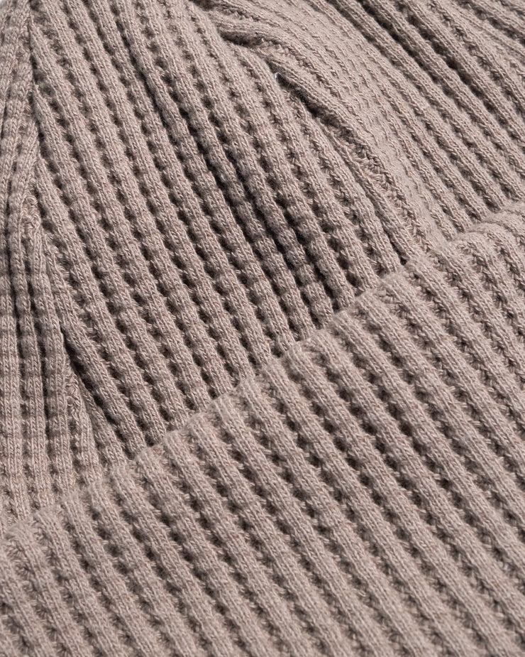 The Waffle Knit Cap is crafted in Japan from 100% cotton using raffy cotton yarn, known for its distinctive irregular texture. Knitted on a double jacquard machine, the fabric forms a bold, oversized waffle pattern that gives the cap a warm, substantial feel while retaining durability.