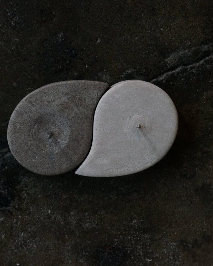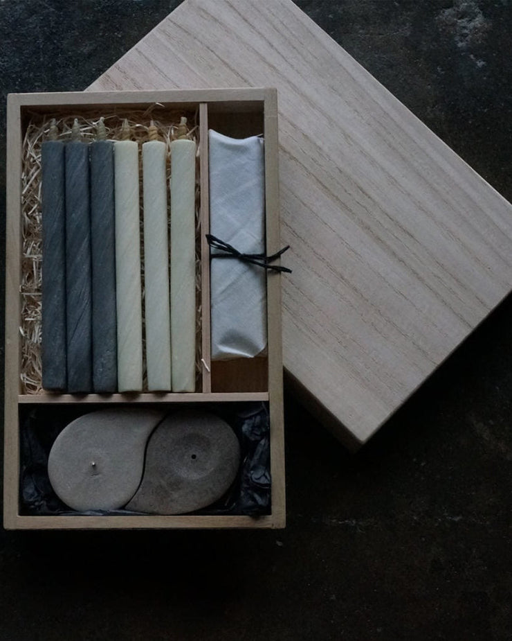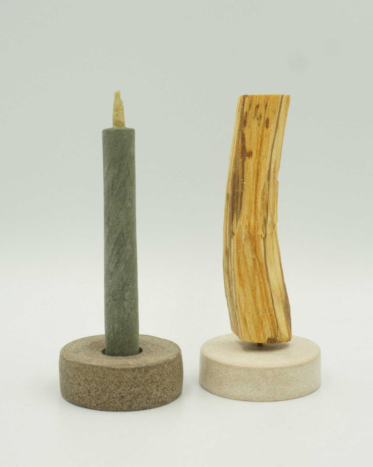 Accompanying the candles is a Palo Santo stick and stand. Known as the “sacred tree” in South America, Palo Santo is used for ritual smudging—its fragrant smoke said to drive out negativity and welcome good energy. The two included stands, unified in black and white, symbolise yin and yang—the harmony of opposites.