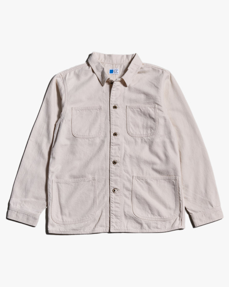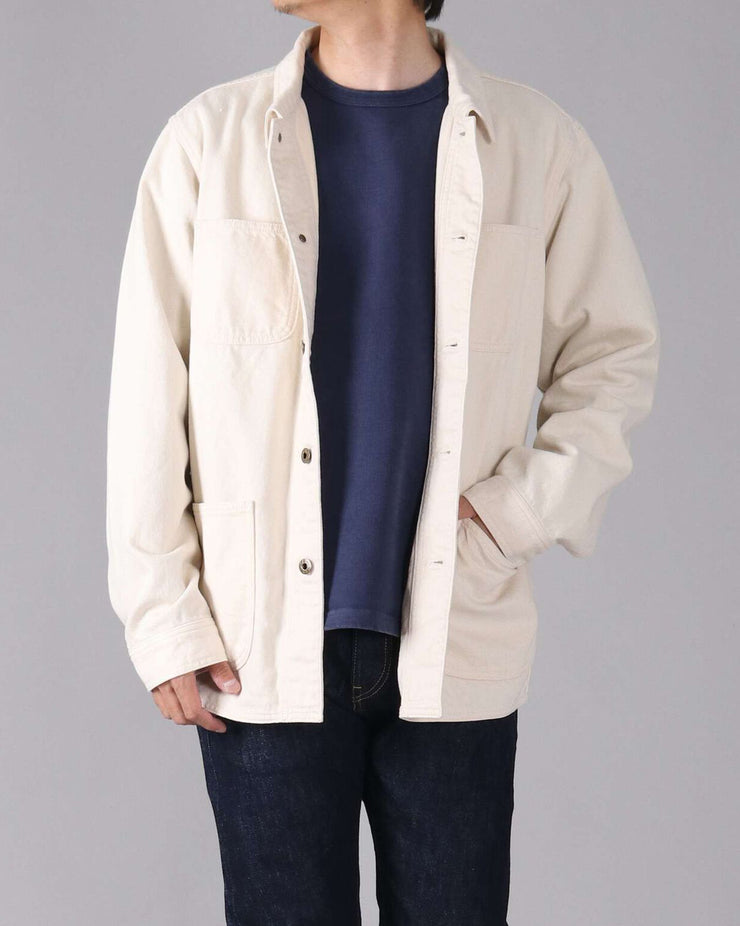 The organic drill fabric is woven from thick organic yarns, giving it a sturdy, substantial hand. Pre-washed and tumble-dried, it arrives with a soft, lived-in texture from day one, avoiding the stiffness often associated with heavier cloth. Despite its weight, it remains comfortable for all-day wear. Crafted entirely in Kojima, Okayama—Japan’s denim capital—this jacket reflects a commitment to full domestic production, from fabric development through to final stitch.