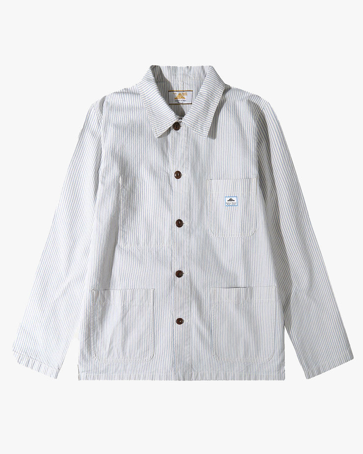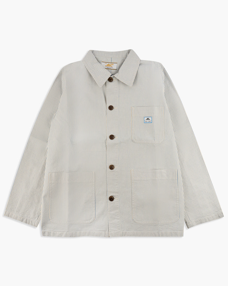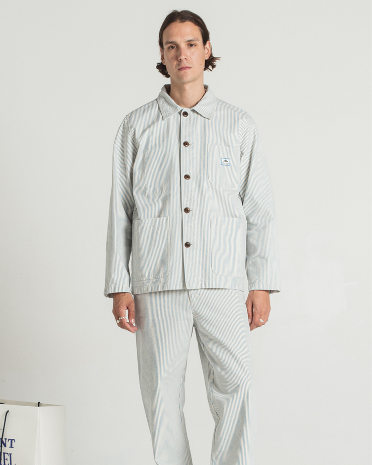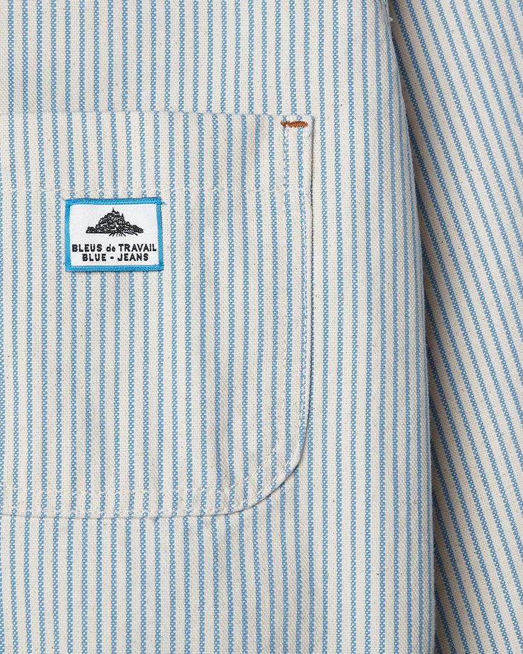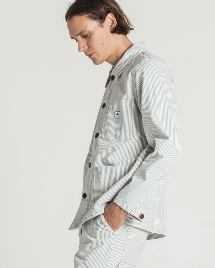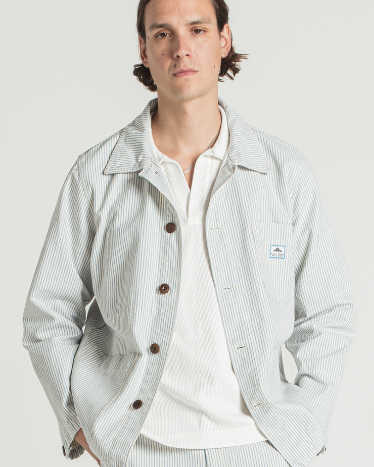 This work jacket combines elegance and functionality with its two large pockets. Its fine stripes are revisited in a contemporary version. The collar and buttons in genuine corozo made in France add a touch of refinement to this piece inspired by the marine atmosphere.