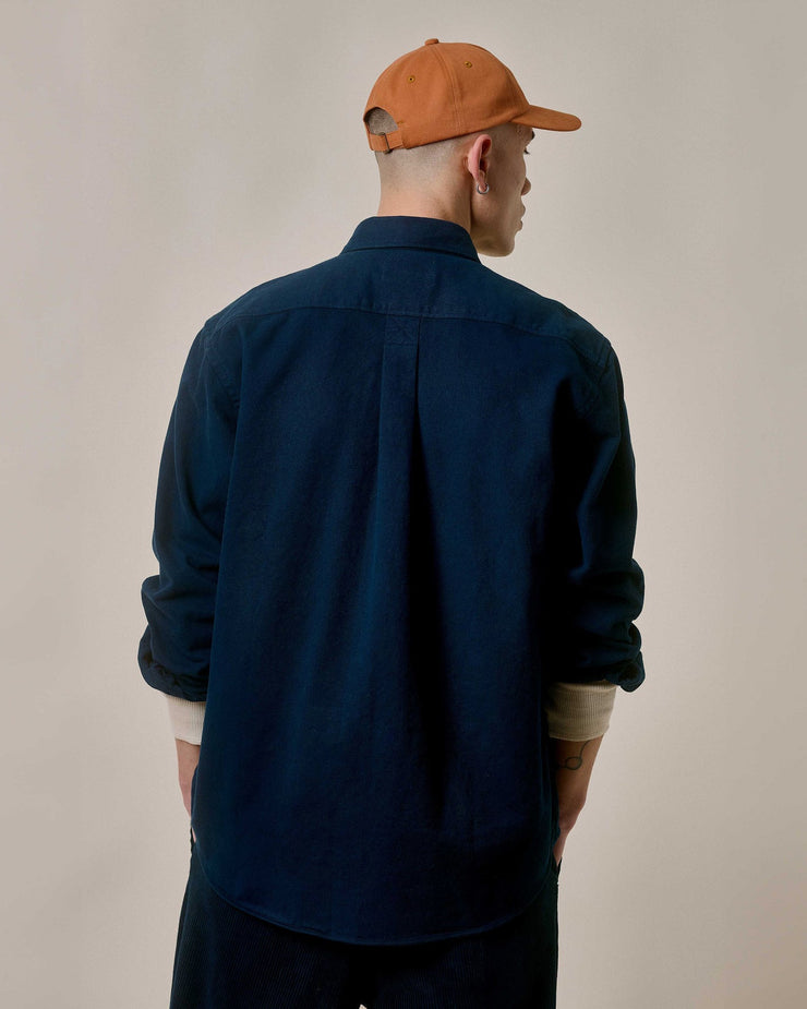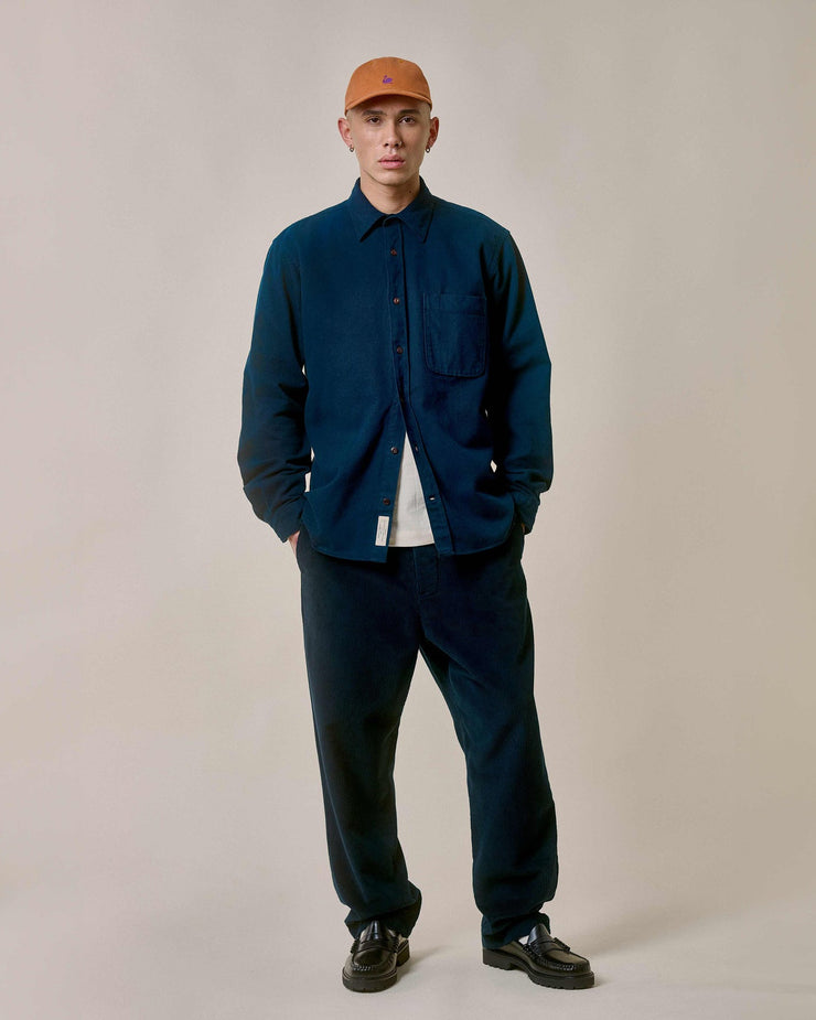 This overshirt is crafted from a sturdier, heavier cotton to provide warmth and structure, making it an ideal piece for the cooler months. Designed in a relaxed yet refined fit, it works perfectly as a layering piece, balancing casual comfort with thoughtful tailoring. Details such as the single chest pocket, vegan corozo fish-eye buttons, back pleat, and underarm triangle inserts showcase both functionality and subtle craftsmanship.