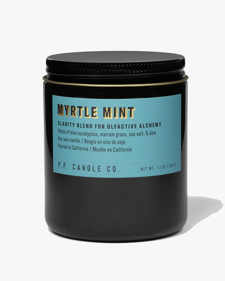 7.2 oz candle, made with domestically grown soy wax and phthalate-free functional fragrance blends. Smoke-colored vessel, black lid, simple label with gold leaf lettering. Poured in P.F.'s California factory. Burns 40-50 hours. 3.5” height x 2.9” diameter.