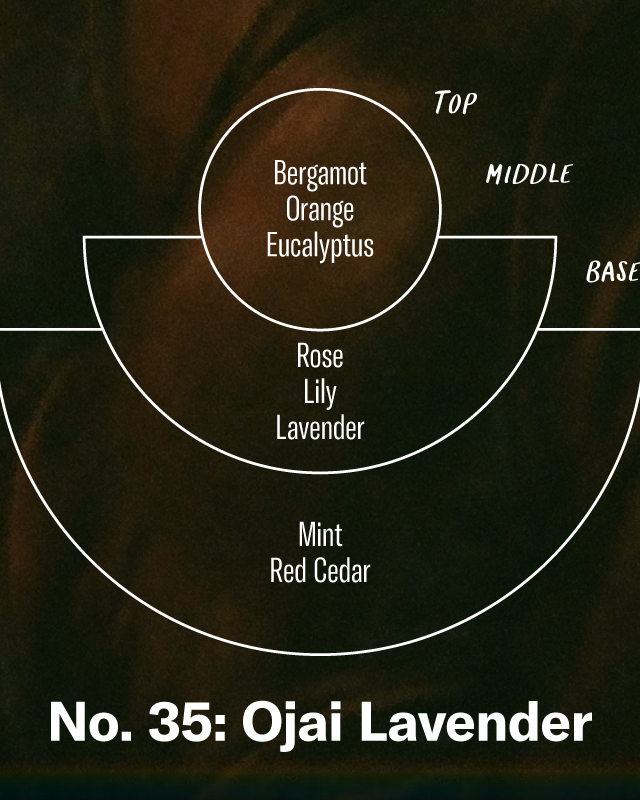 Fragrance family: Fresh & earthy. A calming vortex surrounded by sun-drenched fields, orange groves and lavender farms, jagged mountains washed in a rosy, sunset glow. Aromatic, herbal, citrus. Pixie tangerine, blue lavender, coyote mint.