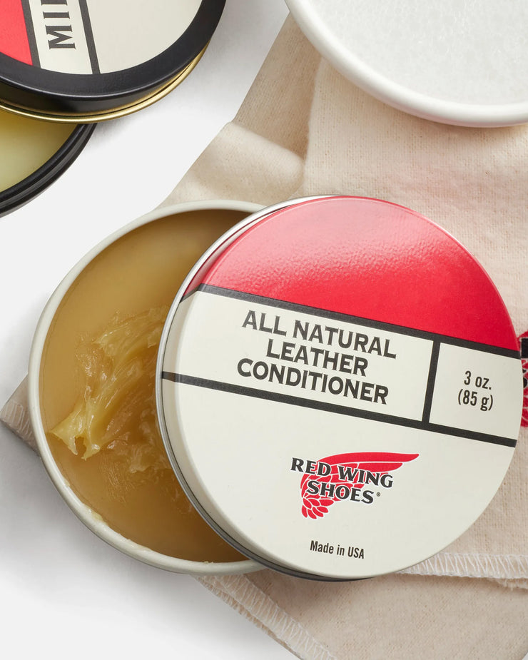 Red Wing All Natural Leather Conditioner is specially formulated to nourish and protect oil-tanned leathers, helping them stay supple, resilient, and water-resistant. Made with natural beeswax, it enhances the leather’s resistance to moisture while conditioning deeply to prevent drying and cracking over time.