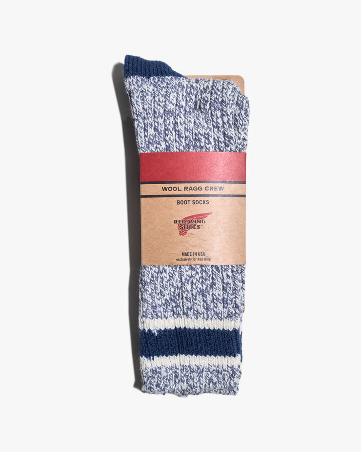 The 97330 Striped Wool Ragg Crew Socks are a heritage-inspired essential built for warmth, comfort, and durability. Among the thickest and longest styles in the range, these ultra-dense wool socks deliver exceptional insulation, making them ideal for cold-weather wear or as cosy house socks. Crafted in a mottled blue and white knit with a navy stripe at the cuff, they combine rugged function with classic Americana style. Meticulously made in the USA using a blend of natural and upcycled fibres, these socks embody quality craftsmanship and sustainable design.