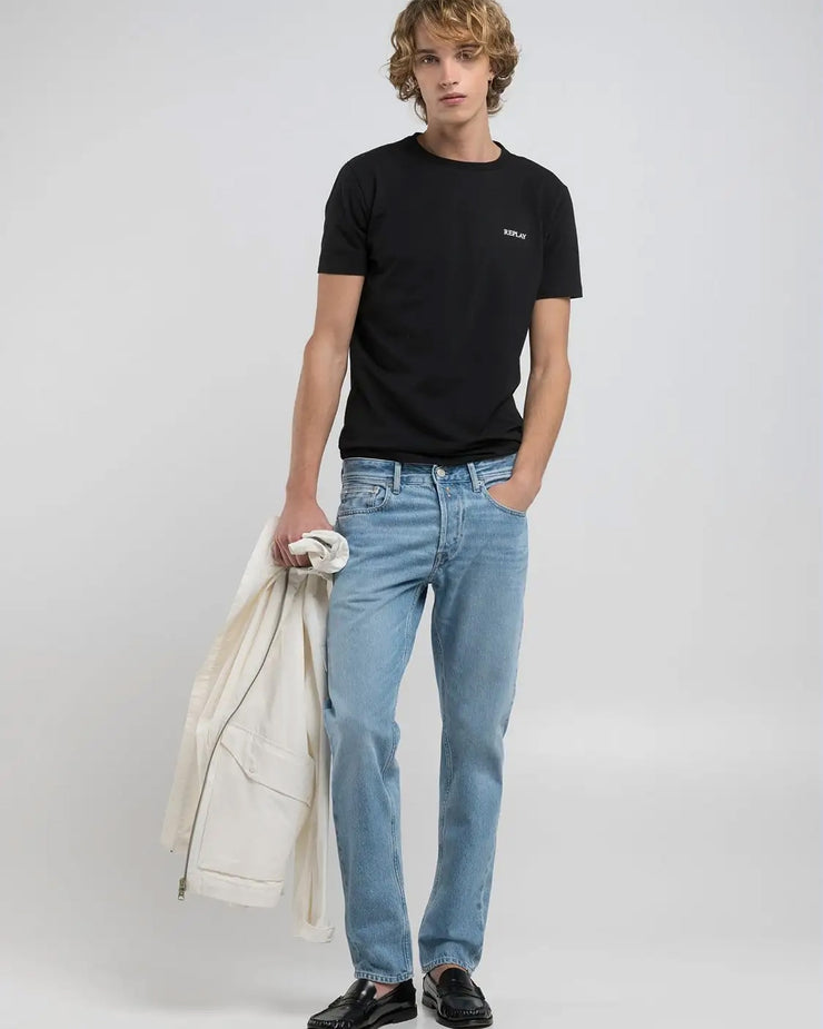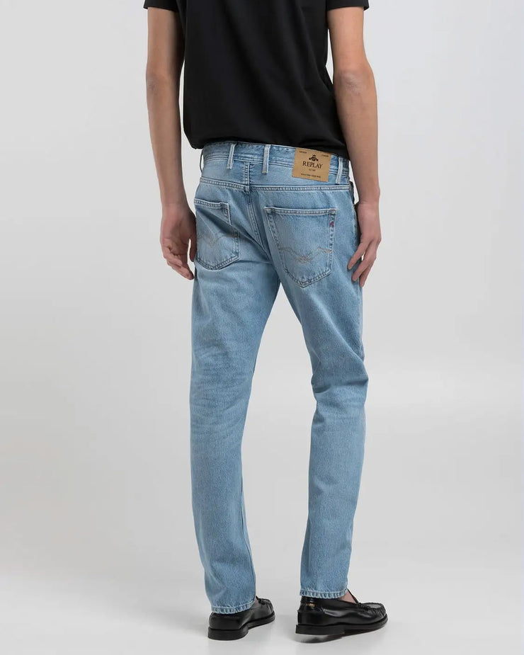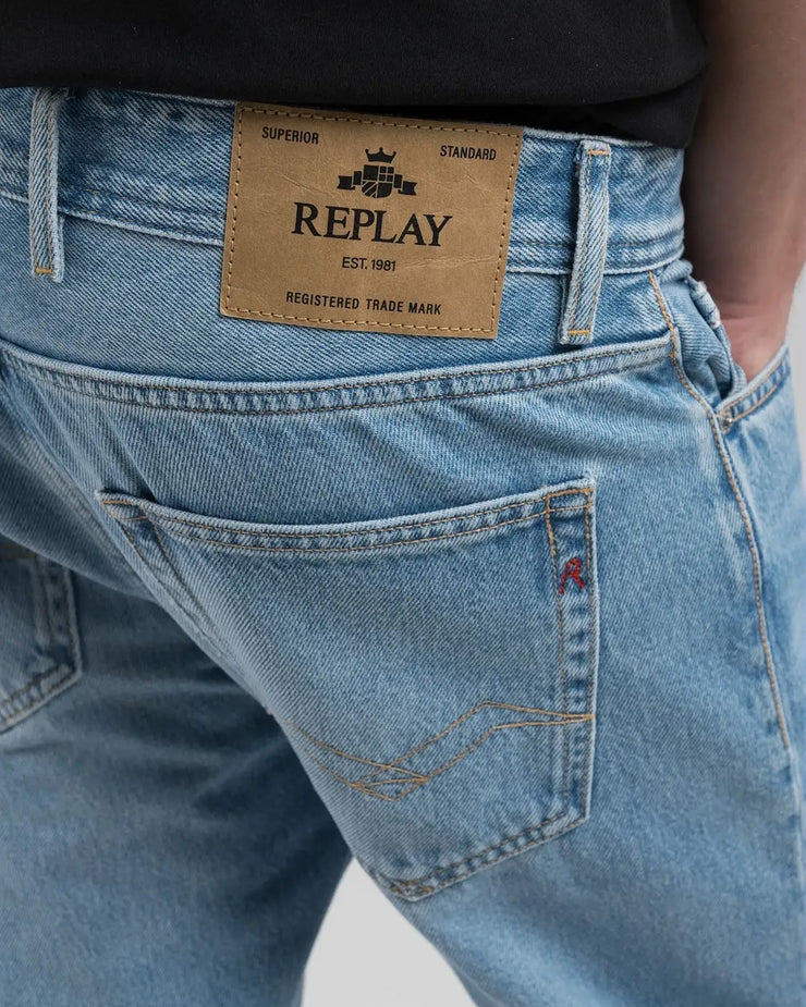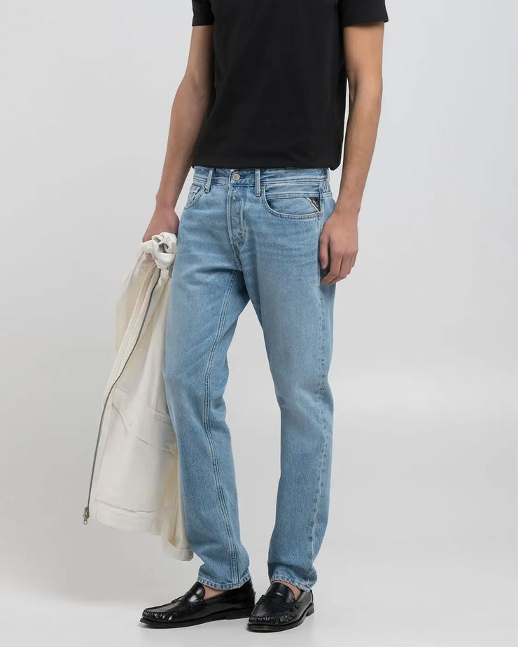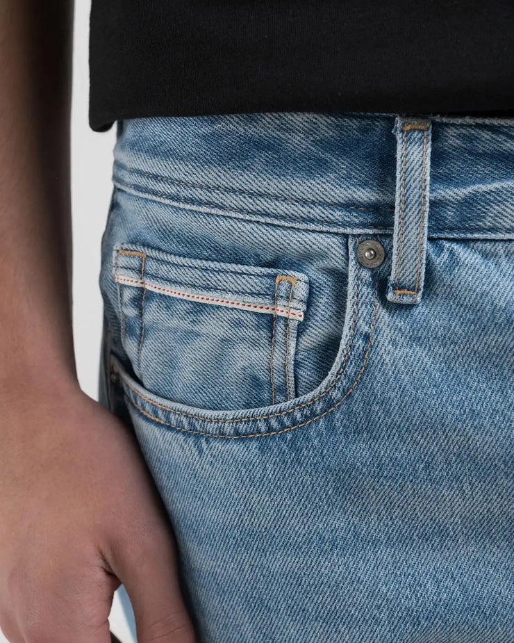 Straight-fit jeans with a regular-rise waist and a straight leg from hip to hem for a comfortable fit. This five-pocket piece comes in 12-oz pure cotton indigo denim with a light wash. The back pockets have the iconic gull-wing stitching and one pocket bears R embroidery, while one of the front pockets features a small branded insert. Button fastening.