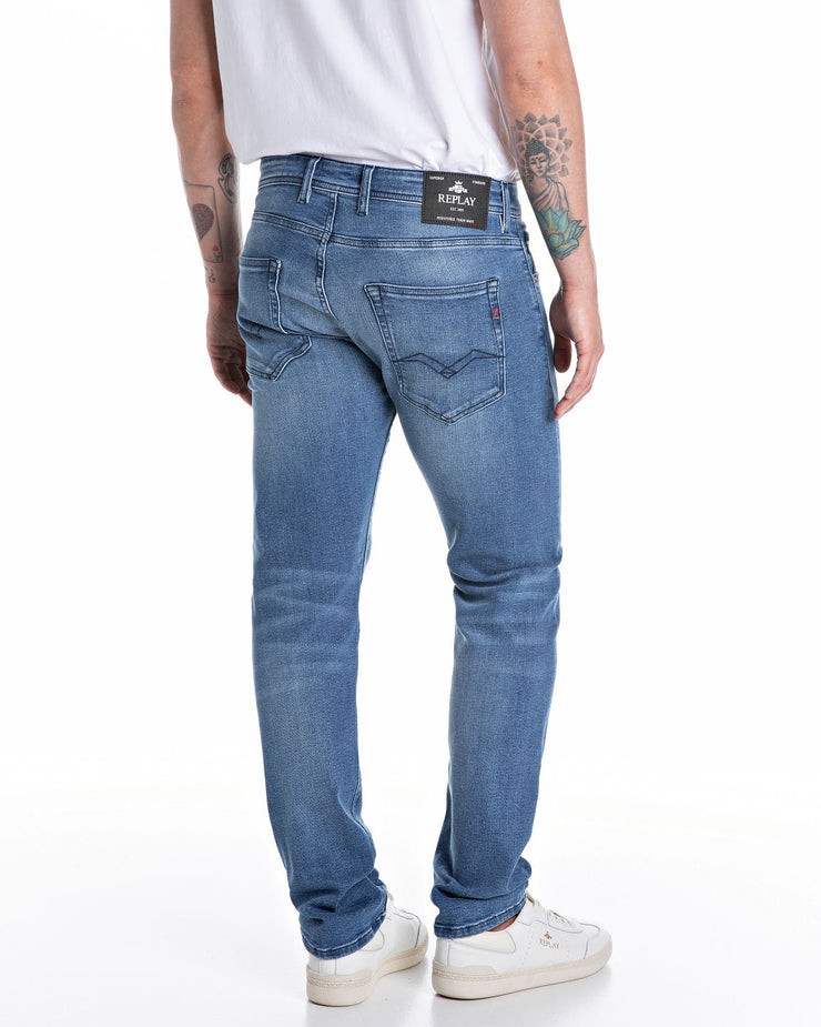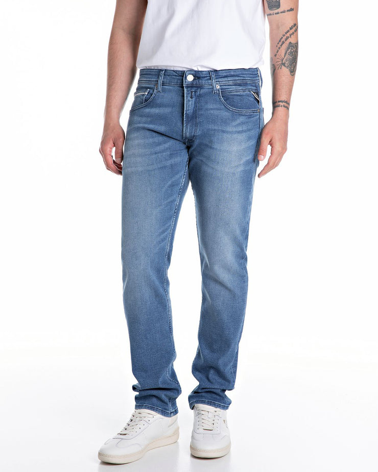 Straight-fit jeans with a regular-rise waist and a straight leg from hip to hem for a comfortable fit. This five-pocket piece comes in 12-oz mid blue power stretch denim with a mid wash. The back pockets have the iconic gull-wing stitching and one pocket bears R embroidery, while one of the front pockets features a small branded insert. Zip fastening.