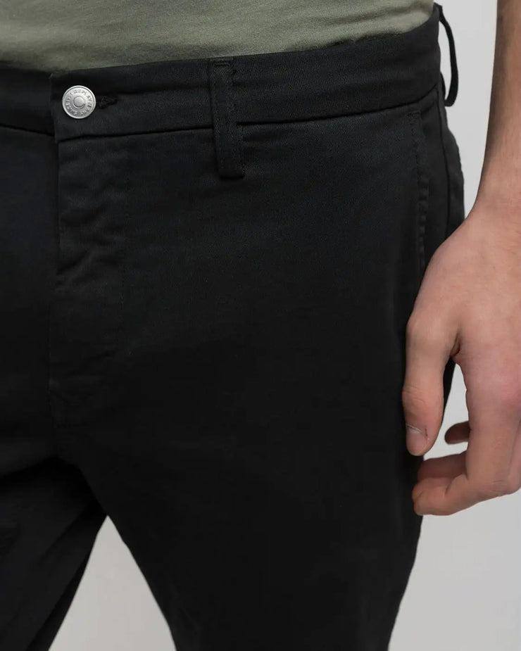 The garment is made of 10.5 oz garment-dyed extra light Hyperflex stretch cotton canvas suitable for all seasons, with a stone wash. With welt pockets, the garment features a zip fly with button fastening.