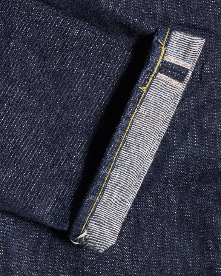 The denim fabric is the strongest 21oz special selvedge. It is a special denim that is not only super-thick, but also very focused on colour fading and texture. It has a special thick uneven thread count of 3.6 and is driven to the limit with an old-fashioned force loom.