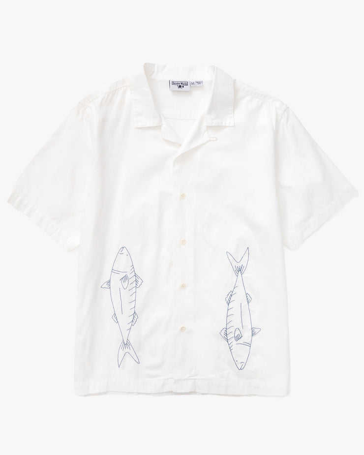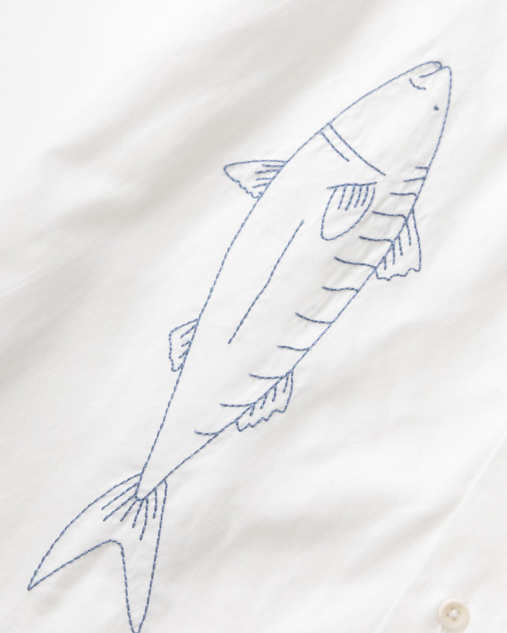 A resort-style collar gives it that easy, open neckline that defines a true summer shirt. The six-button closure is finished with a top button loop for a subtle refinement, while the embroidered mackerel graphic adds character without overwhelming the design. Straightforward in structure, distinctive in detail.