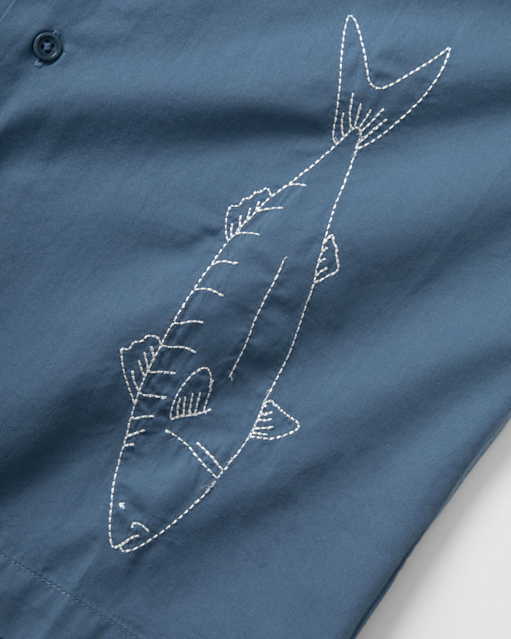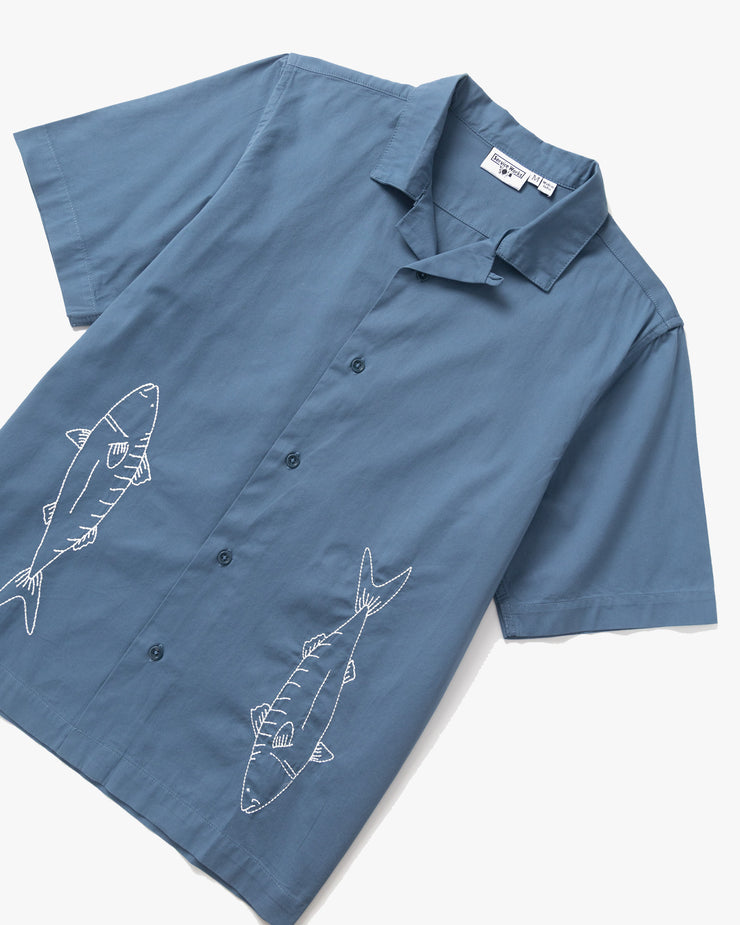 A resort-style collar gives it that easy, open neckline that defines a true summer shirt. The six-button closure is finished with a top button loop for a subtle refinement, while the embroidered mackerel graphic adds character without overwhelming the design. Straightforward in structure, distinctive in detail.