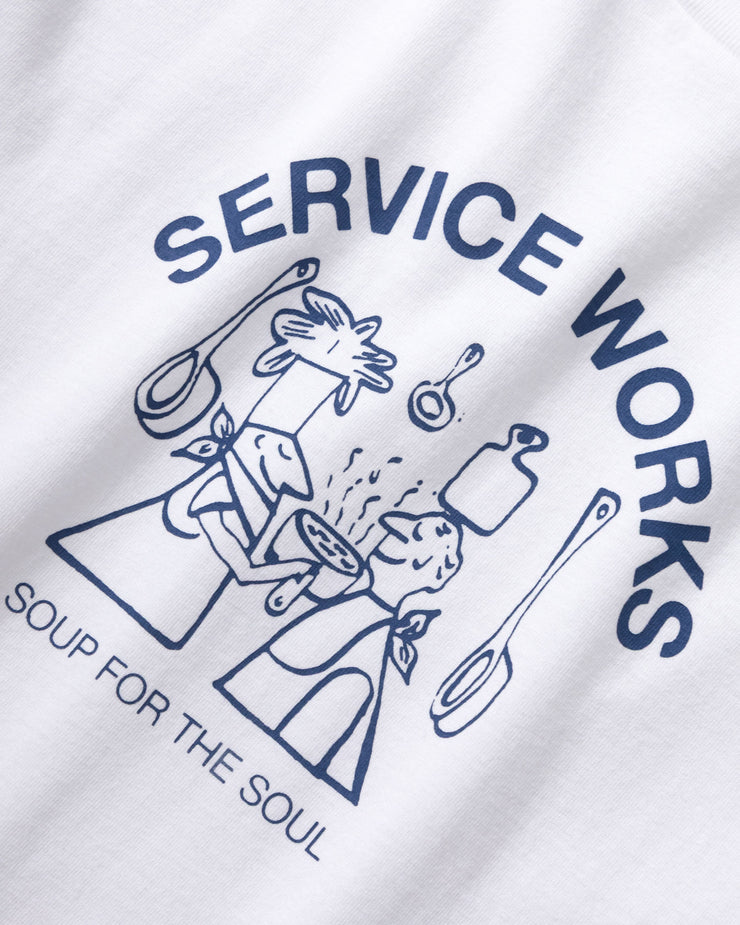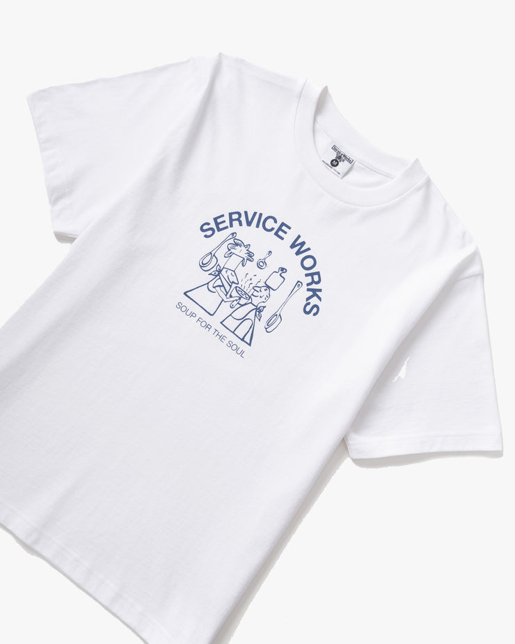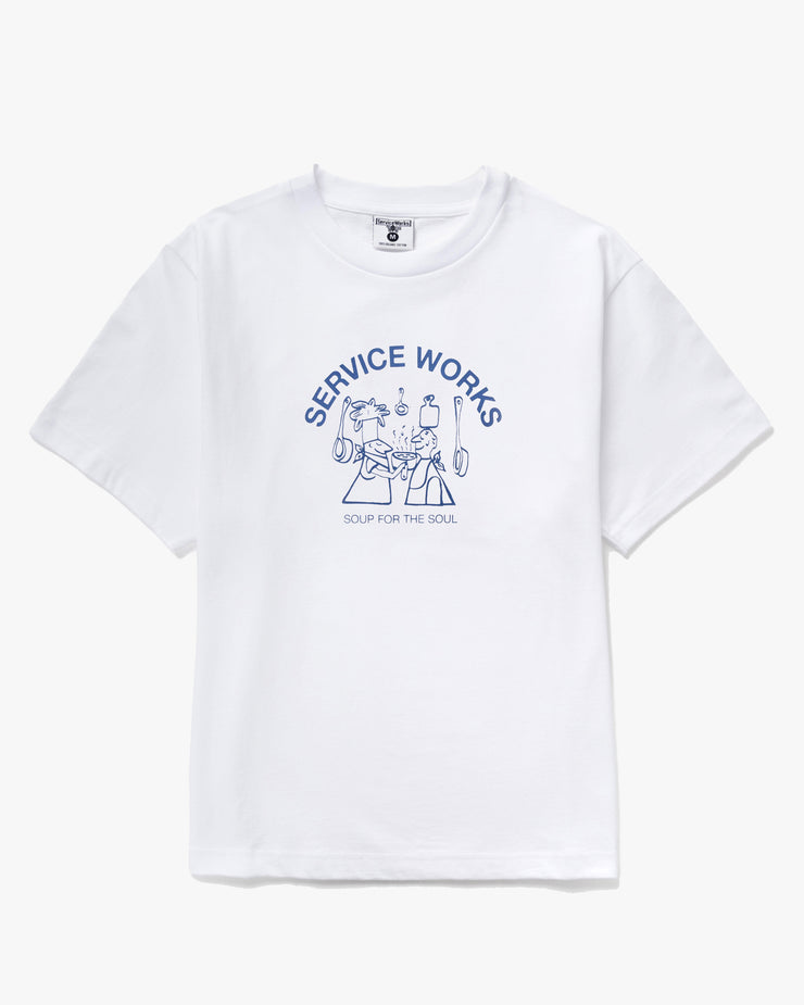 The Soup For The Soul Tee by Service Works is a heavyweight everyday staple with a clean, dependable feel. Constructed from 250gsm GOTS-certified organic cotton, the fabric has a substantial hand and structure, offering durability while remaining comfortable against the skin.