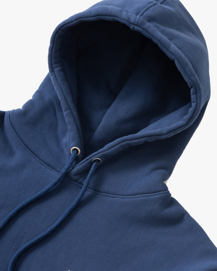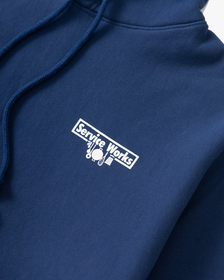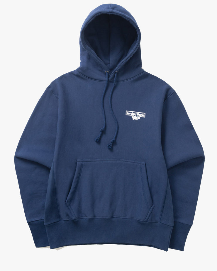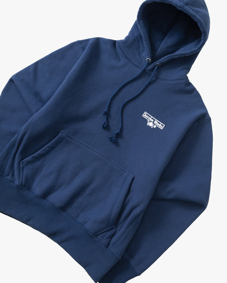 The Heavyweight Trademark Hoodie by Service Works is built for comfort, durability, and timeless everyday wear. Crafted from dense 550gsm GOTS-certified organic cotton, it offers a premium feel with a structured silhouette that softens beautifully over time. The classic navy tone is paired with a screen-printed logo graphic, elasticated cuffs and waistband for a secure fit, and a kangaroo pocket that adds both warmth and function. A dependable essential that balances workwear toughness with casual ease.