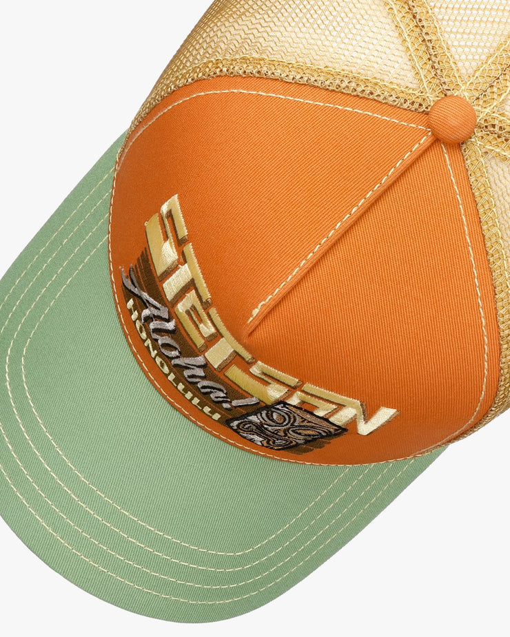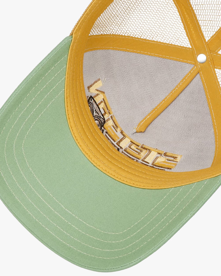 Construction details: Classic trucker cap shape, curved peak, breathable mesh back, snapback fastening, tonal front motif