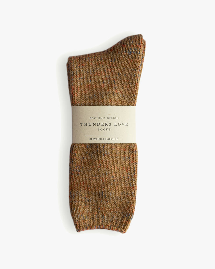The Thunders Love Wool Collection Recycled Socks are crafted from soft, eco-friendly recycled wool, blending sustainability with refined design. Knitted in a solid colour, the socks reveal subtle glimpses of thinner multicoloured yarns woven inside, creating a beautifully nuanced texture and colour effect.
