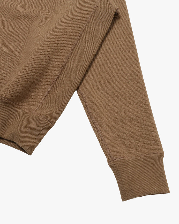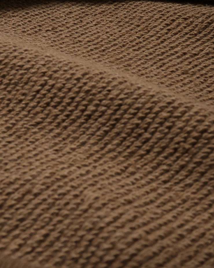The Iron Mordant Foxfibre® Double Heavyweight French Terry Pullover Crewneck in Coyote 80 represents the pinnacle of natural textile innovation and craftsmanship. Weighing an extraordinary 825 GSM (24.3oz per square yard), this is one of the heaviest and most substantial French terry knits available. Its rich, earthy brown tone is achieved not through synthetic dyes but through a meticulous iron mordant treatment applied to naturally coloured Foxfibre® cotton—organically grown on a single-origin farm in New Mexico. The iron reacts with the fibre’s inherent pigments, deepening the hue to a complex, organic brown that continues to evolve and darken beautifully with wear.