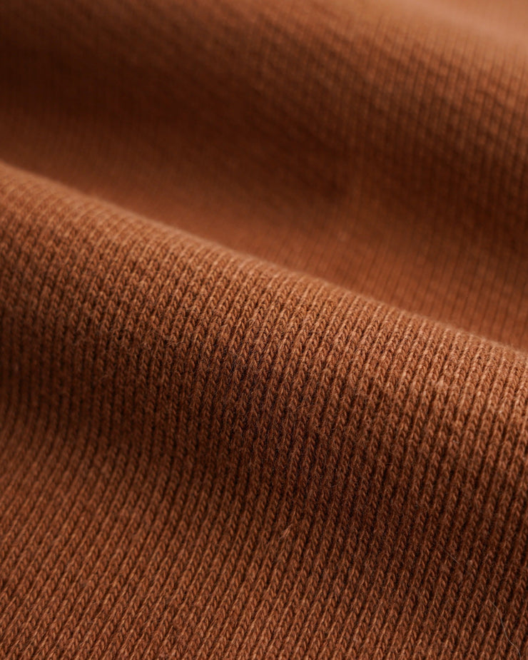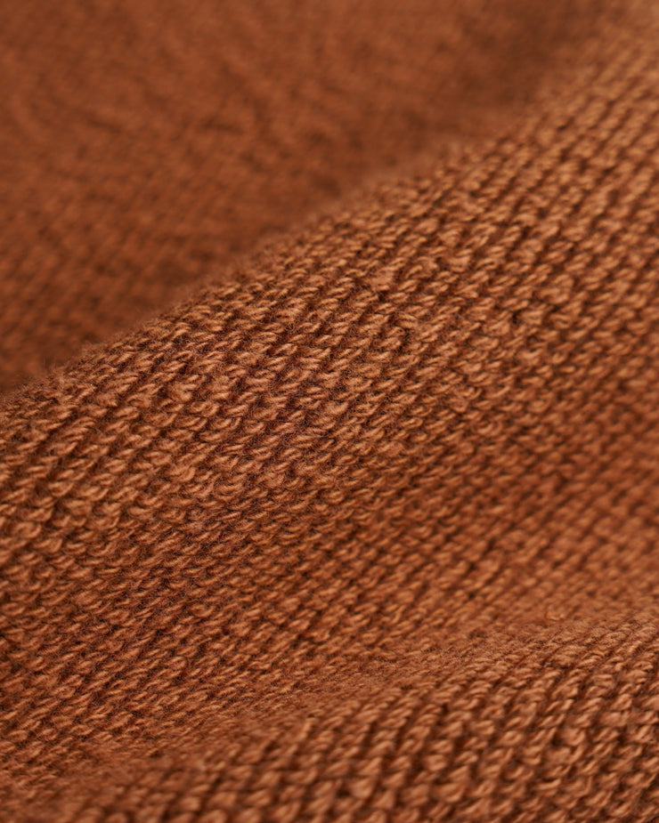 This Wonder Looper Double Heavyweight French Terry Pullover crew neck is built from one of the most substantial knits you’ll ever put on — a true feat of Japanese fabrication. The fabric comes in at a massive 876gsm (25.8oz per square yard), roughly double the weight of a typical heavyweight terry. Knit in Wakayama on low-gauge (10G) circular knitting machines, it has a beautifully irregular character: a rugged outer face and large, soft interior loops that offer incredible warmth and cushioning.