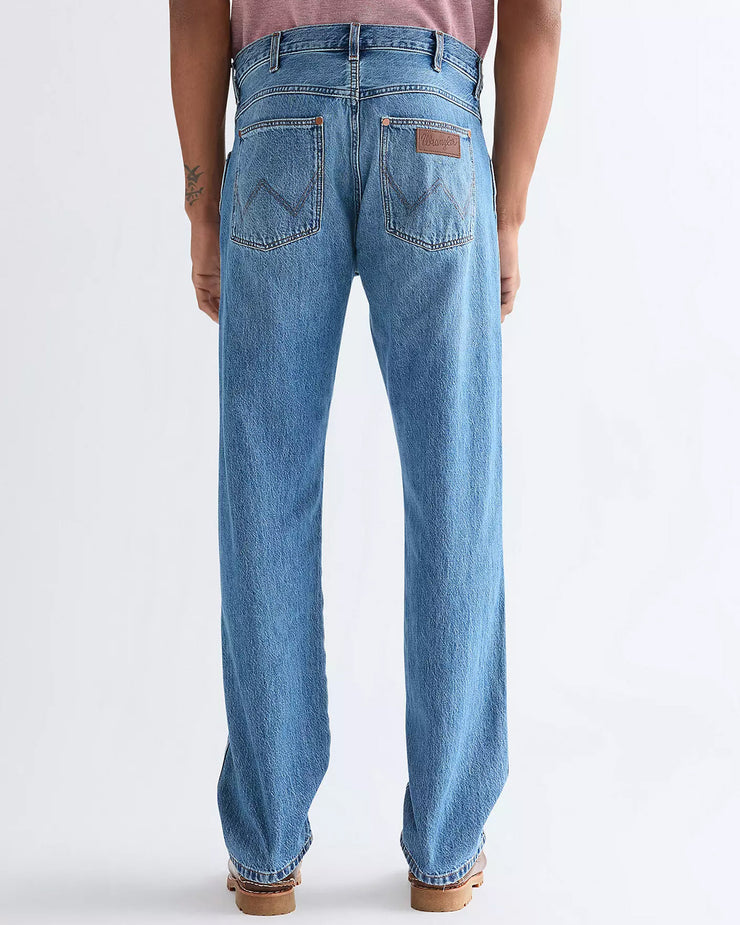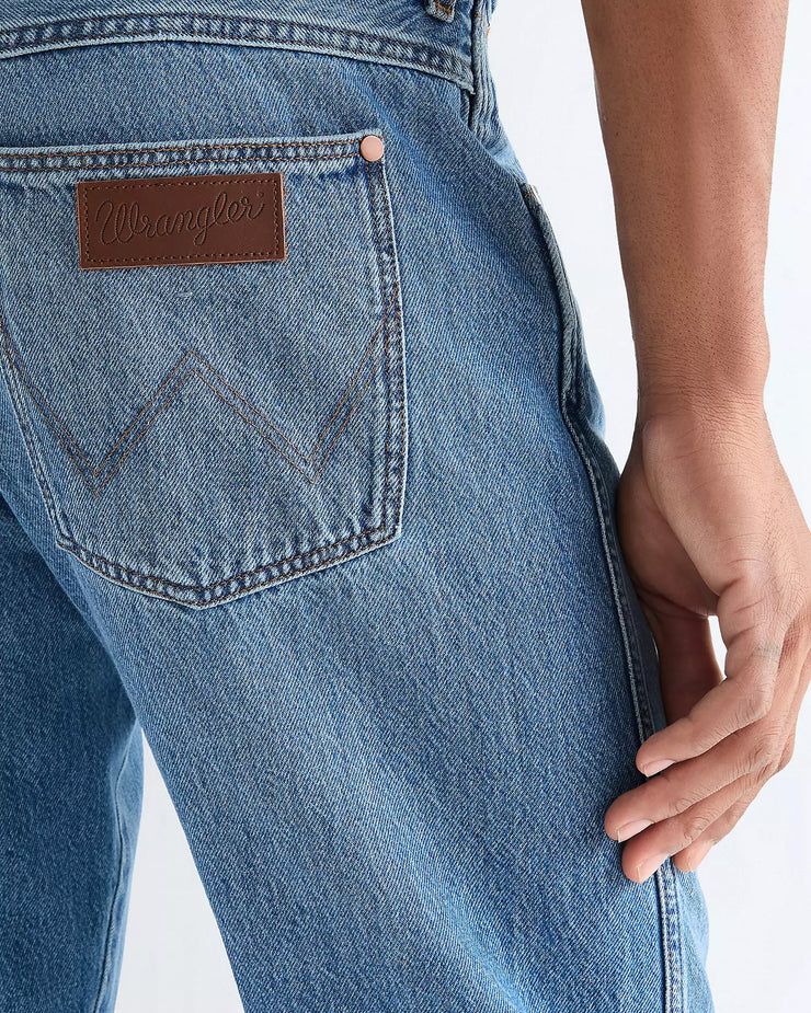 Crafted from rigid 11oz cotton denim, the fabric uses Wrangler’s Toughlite technology to maintain the durability of traditional denim while keeping the weight lighter for improved comfort in warmer conditions. The classic 3/1 right-hand twill construction gives the jeans an authentic denim character, while the Storm Cloud wash offers a versatile blue tone suited to casual daily wear.