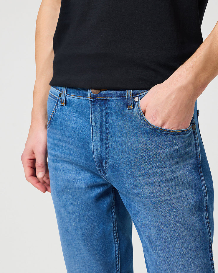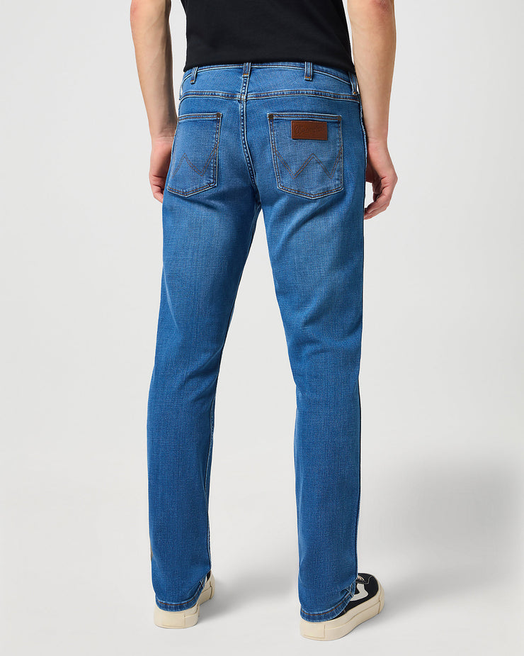 Crafted for the modern trailblazer, these Greensboro jeans come in a mid blue denim that exudes timeless style. Designed for all-season wear, this straight fit silhouette is complemented by a comfortable stretch, thanks to the inclusion of 2% elastane. The classic five-pocket design, zip fly with button closure, and iconic Wrangler leather patch on the back waistband, along with the stitched 'W' on the back pockets, all contribute to a pair of jeans that's as functional as it is fashionable.