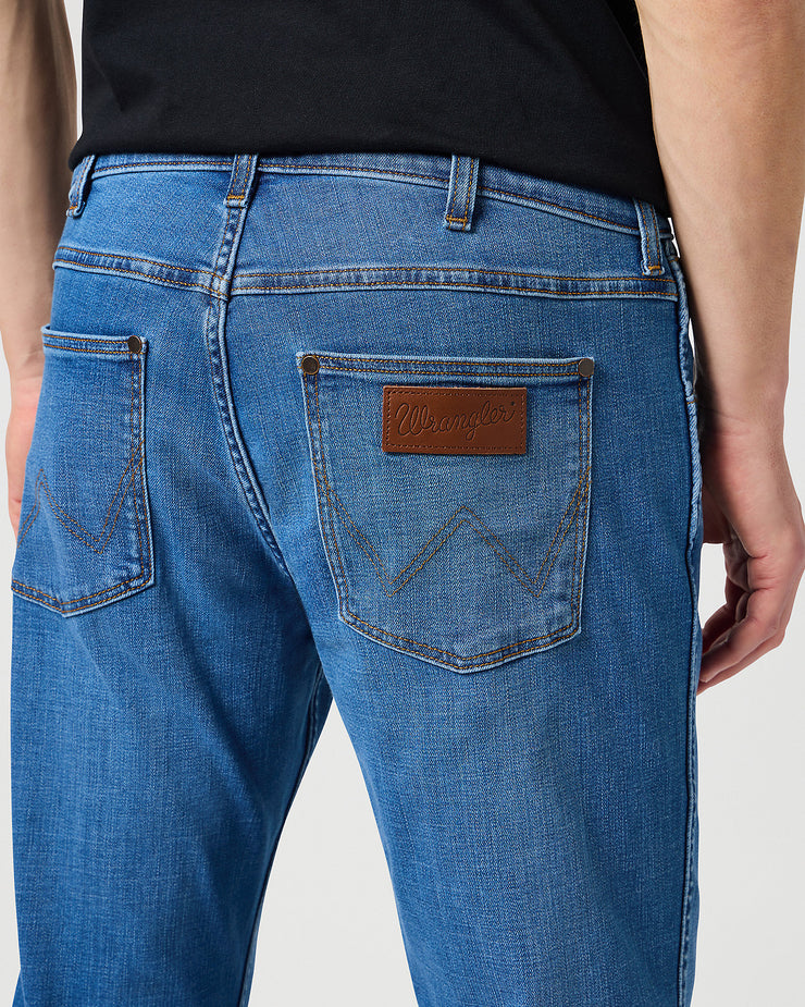 Detailed with Wrangler's signature elements including a zip fly with button closure, the classic five-pocket design, and the iconic leather patch and 'W' stitching.