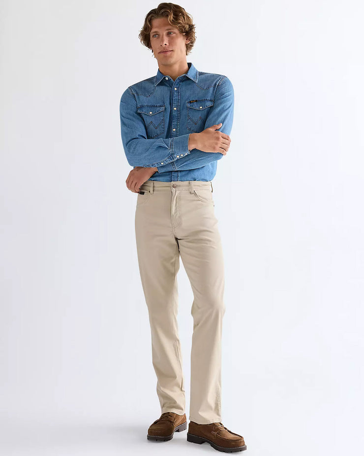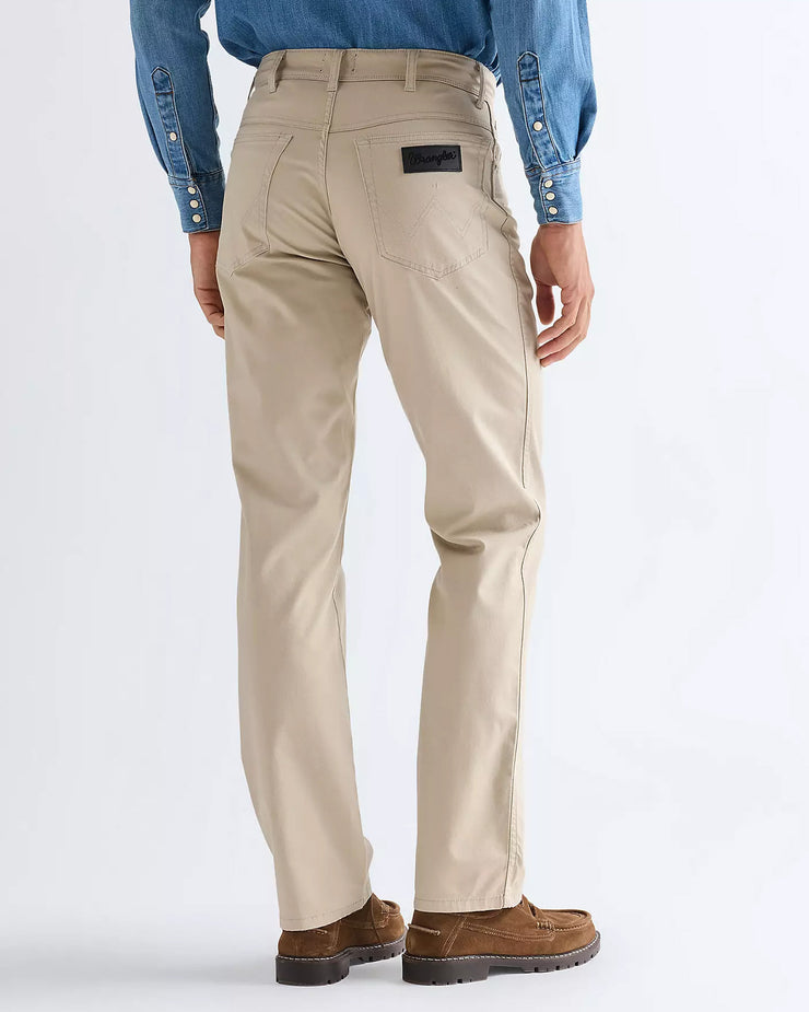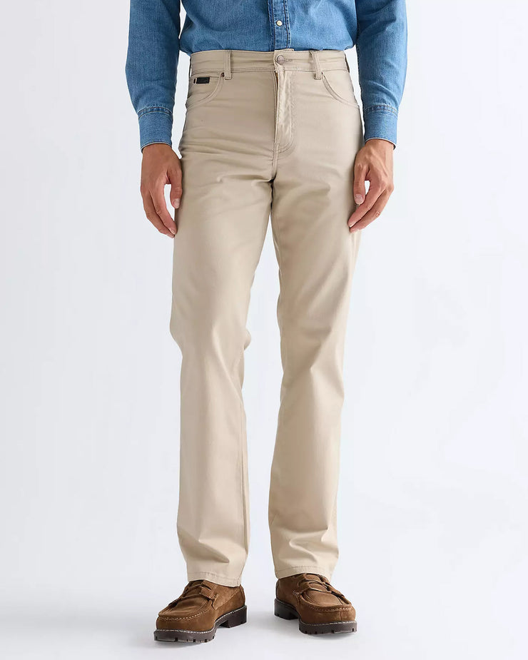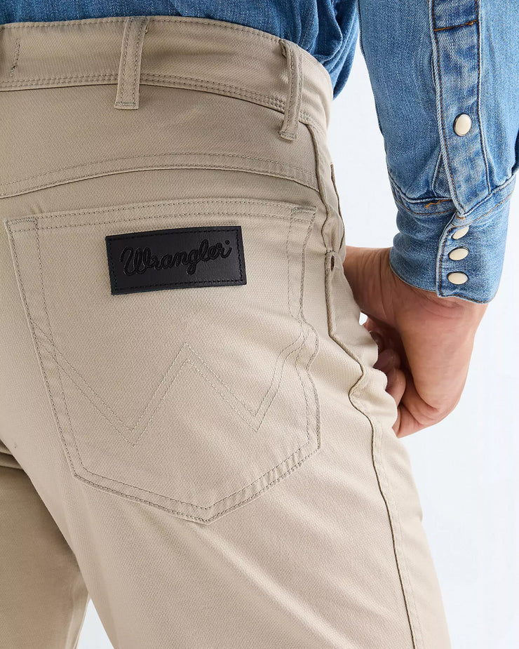 Crafted from 7 2/3oz dobby fabric, the cotton-rich cloth has a lightly textured surface that adds subtle depth without overpowering the clean look. A touch of elastane provides low stretch for extra comfort and flexibility, making them easy to wear throughout the day. Finished in Plaza Taupe, the neutral beige tone keeps them versatile, while signature Wrangler details such as ‘W’ stitching, seven belt loops and a black waxed patch complete the design.