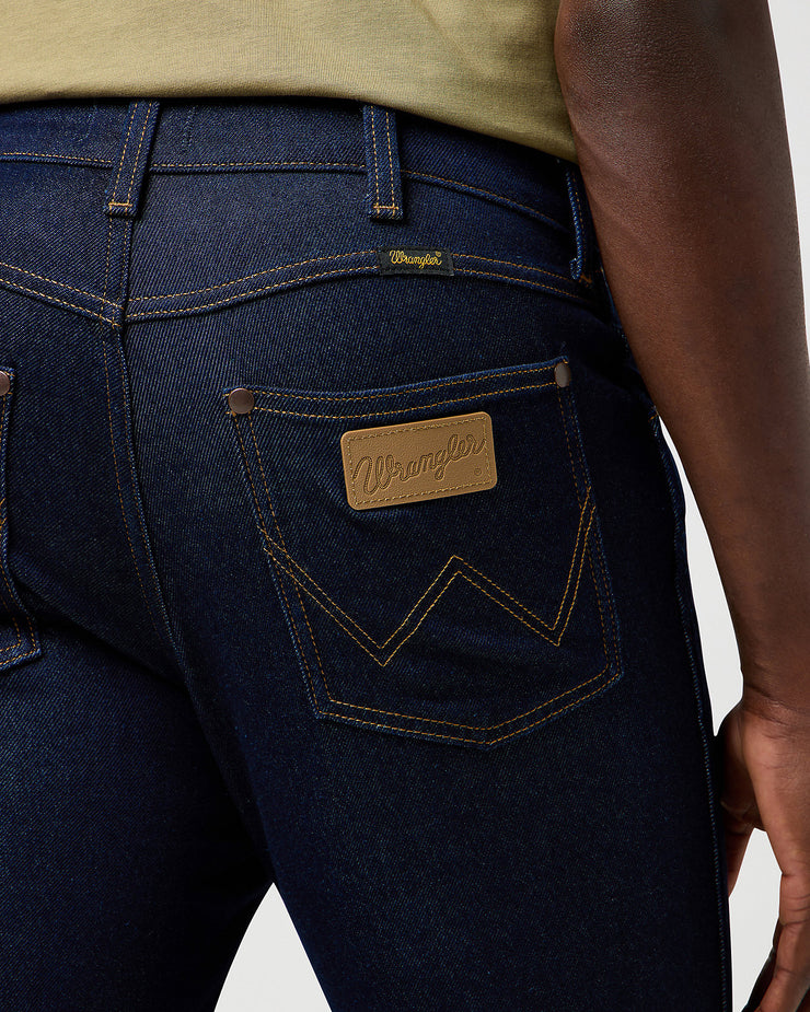 Features: Five-pocket design with coin pocket, 7 belt loops, clean metal hardware, Wrangler ‘W’ stitching, brown leather patch